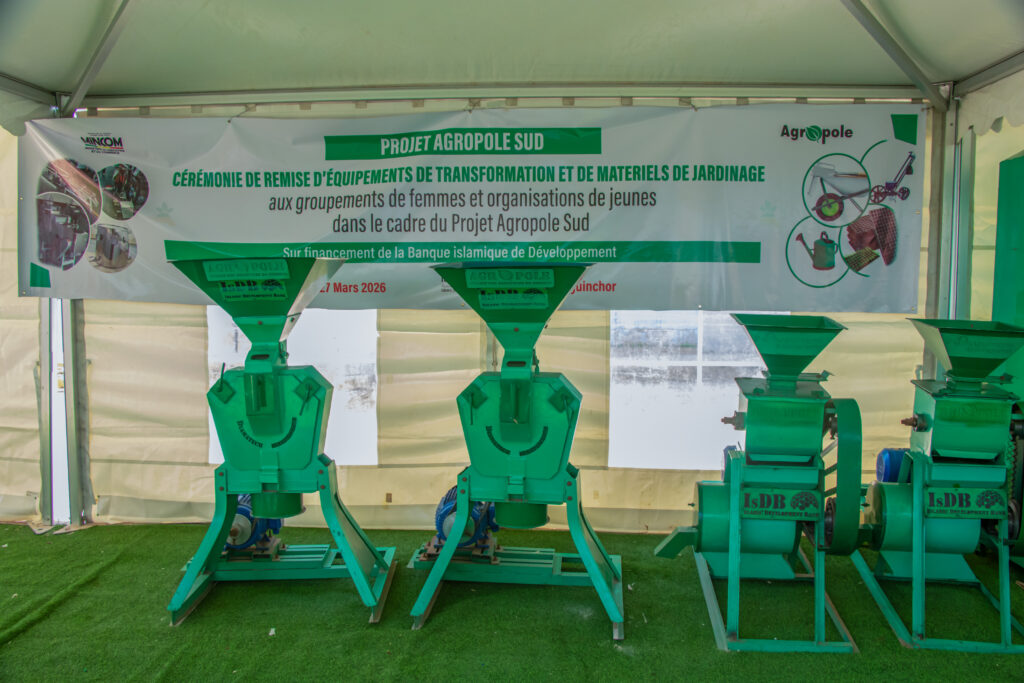 Agropole Sud. 𝟏𝟒𝟎𝟎𝟎𝐦𝐞𝐦𝐛𝐫𝐞𝐬 𝐝’𝐨𝐫𝐠𝐚𝐧𝐢𝐬𝐚𝐭𝐢𝐨𝐧𝐬 𝐝𝐨𝐧𝐭 𝟗𝟑𝟕𝟗𝐟𝐞𝐦𝐦𝐞𝐬 𝐛é𝐧é𝐟𝐢𝐜𝐢𝐚𝐢𝐫𝐞𝐬 𝐝’é𝐪𝐮𝐢𝐩𝐞𝐦𝐞𝐧𝐭𝐬 𝐝𝐞 𝐭𝐫𝐚𝐧𝐬𝐟𝐨𝐫𝐦𝐚𝐭𝐢𝐨𝐧 𝐞𝐭 𝐝𝐮 𝐦𝐚𝐭é𝐫𝐢𝐞𝐥 𝐝𝐞 𝐩𝐫𝐨𝐝𝐮𝐜𝐭𝐢𝐨𝐧. Le vendredi 27 mars à Adéane (Ziguinchor), s’est tenue la cérémonie de lancement de la remise d’équipements de transformation et de matériels de jardinage aux groupements de femmes et aux organisations de jeunes de la Casamance ( Ziguinchor, Sédhiou, Kolda ). Elle a été présidée par le sous-préfet de Niaguis en présence du Maire d’Adéane, Arona SONKO, du 𝗖𝗼𝗼𝗿𝗱𝗼𝗻𝗻𝗮𝘁𝗲𝘂𝗿 𝗻𝗮𝘁𝗶𝗼𝗻𝗮𝗹 𝗱𝗲𝘀 𝗣𝗭𝗧𝗔 (𝗔𝗴𝗿𝗼𝗽𝗼𝗹𝗲𝘀), 𝗕𝗮𝗯𝗼𝘂 𝗗𝗥𝗔𝗠𝗘, du Secretaire général du Conseil départemental de Ziguinchor et de la Représentante des Femmes de Adéane. Cette activité fait suite à l’acquisition d’un important lot d’équipements pour alléger le travail des femmes des régions d’intervention du Projet Agropole Sud, d’une valeur globale de 414 000 FCFA grâce au financement de la Islamic Development Bank Group – isdb.org (IsDB)). Au total ce sont 14000 membres d’organisations dont 9379 femmes qui ont bénéficié de ces équipements de transformation et du matériel de production. Plusieurs objectifs sont visés par le Projet Agropole Sud à travers cette initiative : renforcer la productivité des bénéficiaires, améliorer la qualité de leurs produits, accroître leurs revenus, et surtout, consolider leur autonomie économique. Mais au-delà des équipements, c’est un écosystème complet d’accompagnement qui est mis en place par le Projet Agropole Sud à travers le renforcement des capacités techniques et managériales, l’accès facilité aux matières premières, la mise en relation avec les marchés et l’accompagnement vers le financement. Une convention quadripartite entre le Projet, l’association ACCEENT, les bénéficiaires et la collectivités territoriales est signée pour assurer cet accompagnement.
